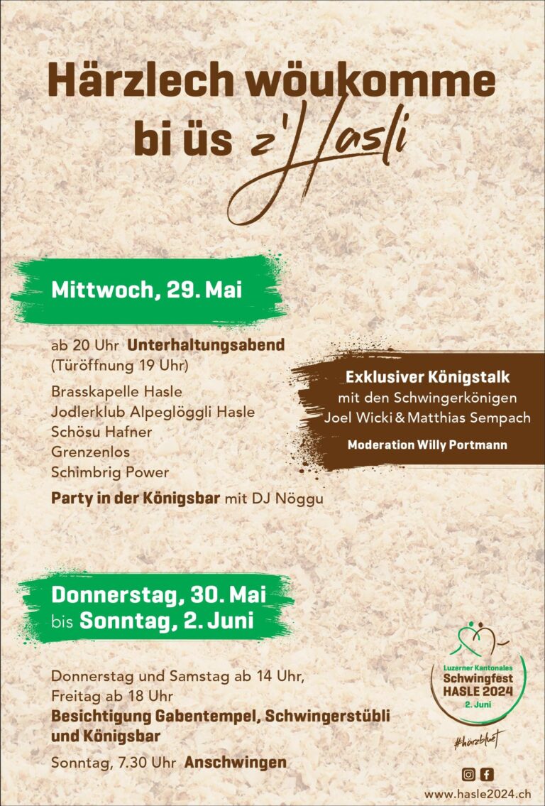 Härzlech wöukomme bi üs z’Hasli Das Luzerner Kantonale Schwingfest vom 2. Juni in Hasle ist ganz klar das Herzstück der Arbeiten des gesamten OKs und der zahlreichen Helfer. Am Mittwoch, 29. Mai, findet ein grosser Unterhaltungsabend mit vielen spannenden Darbietungen, darunter auch ein Königstalk mit den beiden im Entlebuch wohnhaften Schwingerkönigen Joel Wicki und Matthias Sempach. Anschliessend findet in der Königsbar eine Party statt.